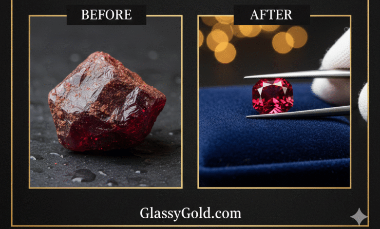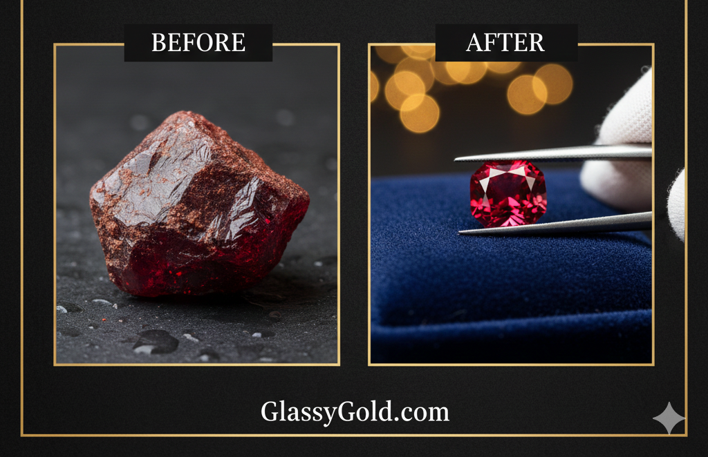 Welcome to the GlassyGold blog! If you’ve been captivated by our recent video on YouTube and TikTok, you’ve witnessed the breathtaking transformation of a truly exceptional gemstone. Today, we’re taking you deeper into the full story behind the Cuprite “Fiery Heart” – a journey that highlights the meticulous process of turning a beautiful, raw crystal into a flawlessly cut and polished jewel, perfectly ready for a bespoke ring setting. Discover the intense secrets held within this rare, crimson-red stone and the intricate artistry involved in bringing its hidden brilliance to light.