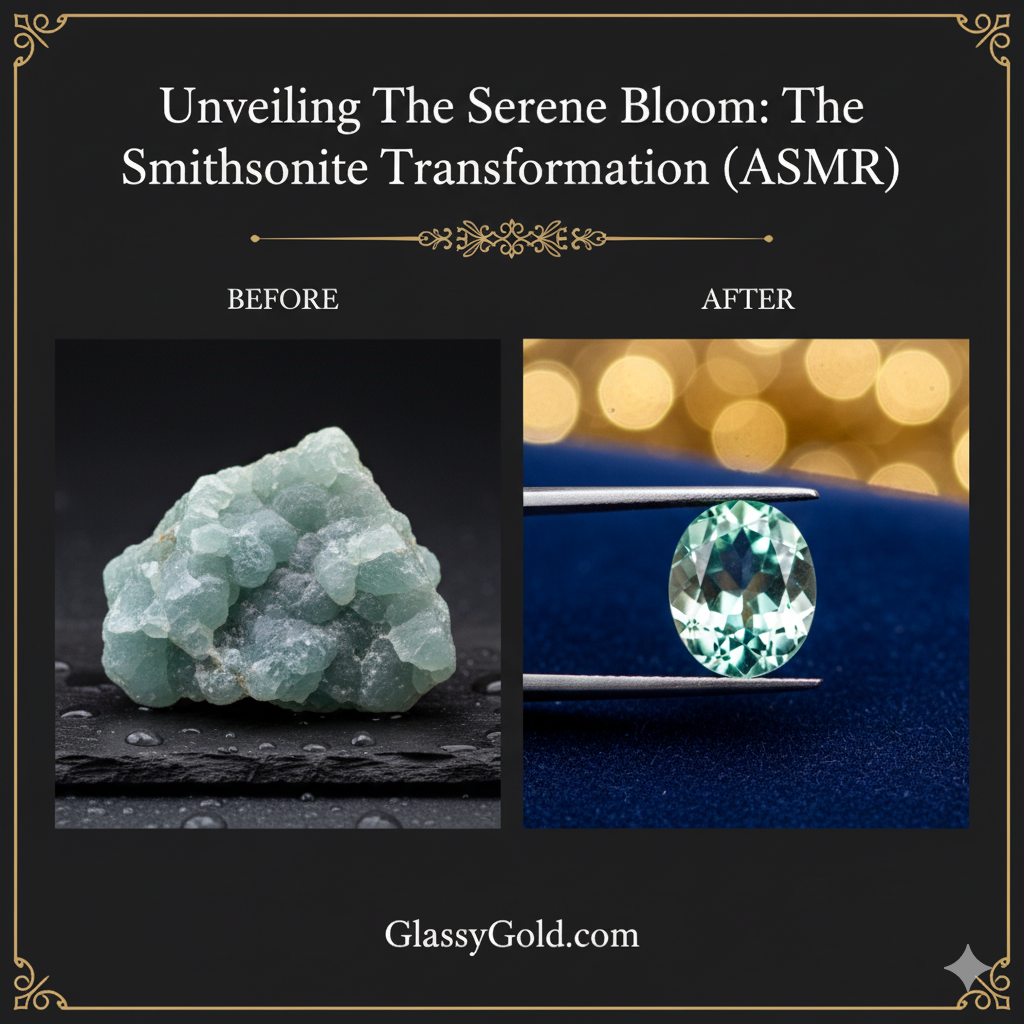 Welcome to the GlassyGold blog! If you’ve been captivated by our recent video on YouTube and TikTok, you’ve witnessed the stunning transformation of a truly exceptional gemstone. Today, we’re taking you deeper into the full story behind the Smithsonite “Serene Bloom” – a journey that highlights the meticulous process of turning a beautiful, unpolished crystal into a flawless, custom-cut jewel. Discover the secrets held within this rare, pastel-hued stone and the intricate artistry involved in bringing its hidden brilliance to light.