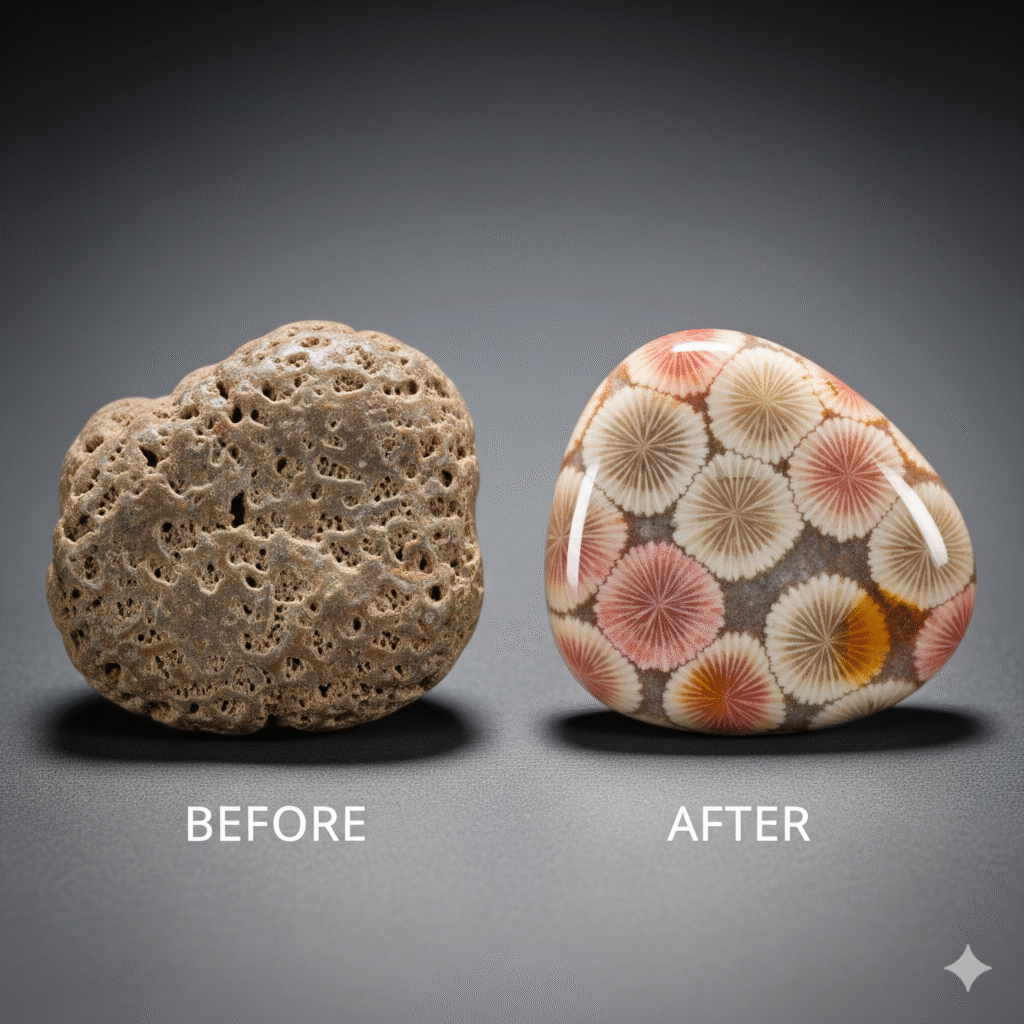 - The Reveal: We begin by carefully splitting the raw, rough nodule. This initial cut is crucial, as it unveils the intricate coral patterns lying dormant within – a truly breathtaking moment as ancient life comes to light.